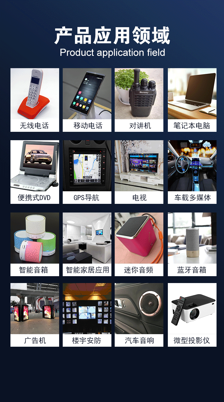 产品适用于:手机,平板电话,智能手表,穿带设备,仪器仪表,医疗设备,汽车,智能家电,数码,安防,消防,电脑主板,电子秤,POS机,各种报警提醒,……