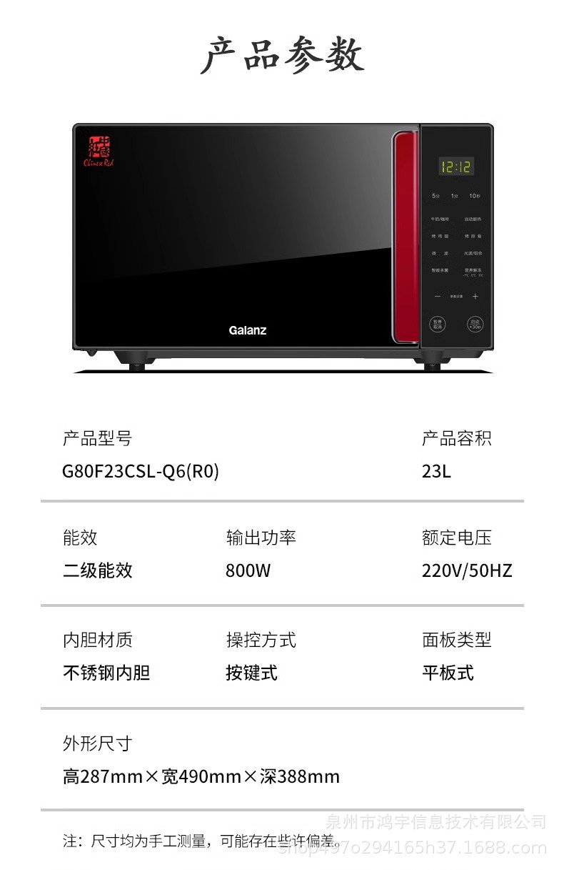 $1660| Brand : Gebasi,Galanz microwave oven G80F23CSL-Q6R0,Before 2022,Galanz microwave oven G80F23CSL-Q6R0,Regular microwave oven,Microwave,Computer type,Flat type,20-25L,Stainless steel,Tablet,220V,800W,287*490*388,Fully automatic,Black microcrystalline panel,Nationwide warranty,4-5 people,Yes,1,2013010714644551,Intelligence is not supported.,800W,Galanz microwave oven G80F23CSL-Q6R0 [23L capacity]],Microwave oven |