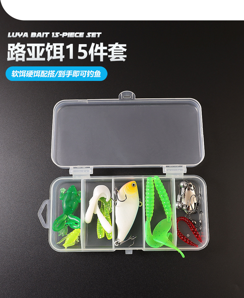 15件套鱼饵因批次不同,鱼饵颜色形状有部分变化,但不影响其功能和数量。