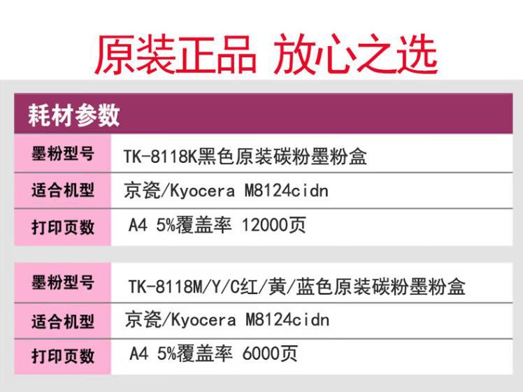 $1660| Brand : Kyocera (Kyocera),181,TK-8118,Powder box,National Joint Insurance,Digital Copier,Kyocera M8124cidn,No,Page 12000,TK-8118,No,TK-8118 K black (12000 pages),TK-8118 Y yellow (6000 pages),TK-8118 M Red (6000 pages),TK-8118 C cyan (6000 pages),No,Original Consumables |